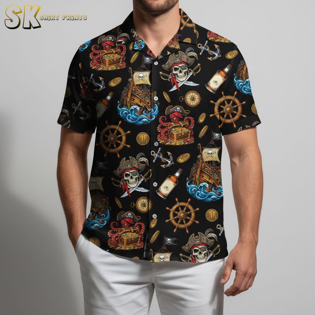 Black Pirate Hawaiian Shirt For Men Women – Skull Treasure Chest Design Summer Shirt