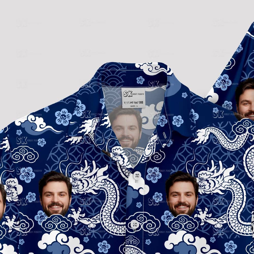 Turn ordinary parties into unforgettable moments with a Hawaiian shirt featuring your face or your pet’s! These tropical shirts are a hit at summer events and themed gatherings. The vivid blue color, cool dragon pattern, and your own faces guarantee loads of laughs and attention.