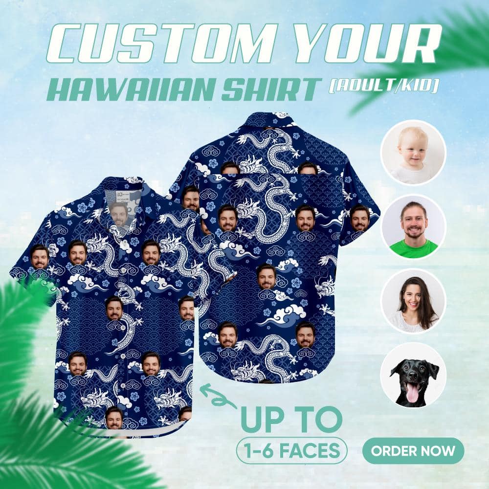 Do you want a shirt that’s as unique as you? Our personalized Hawaiian shirts let you add up to 6 faces—babies, friends, pets, or anyone you love. Each shirt is hand-crafted, blending your chosen photos into the stunning blue dragon print. From birthday surprises to fun family vacations, everyone can join the fun.