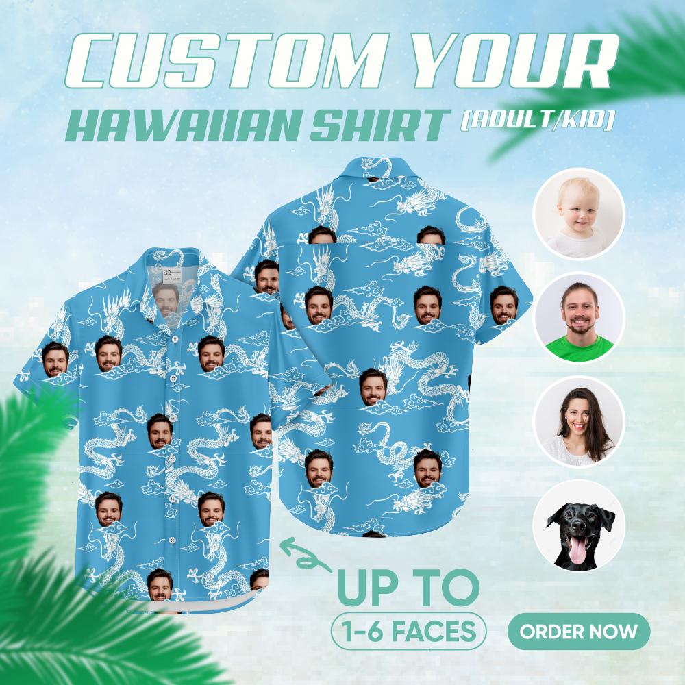 Bring fun, creativity, and memories everywhere you go with the blue Hawaiian shirt (Dragon Edition). Each one is made to order with your favorite faces and stunning dragon art. Perfect for making new memories, giving the best gifts, or just showing off your wild side.