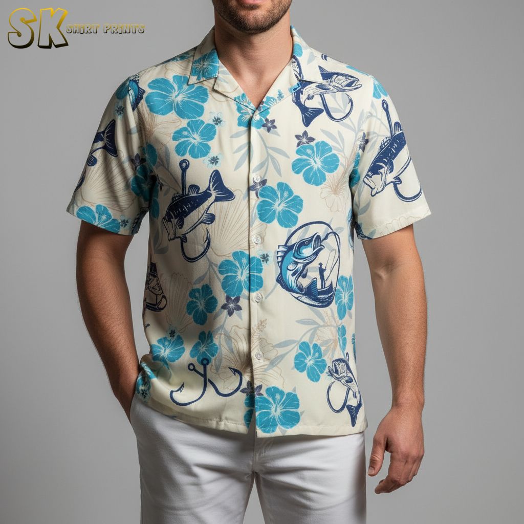 Blue Hibiscus Hawaiian Shirt with Fish and Fishing Hooks – Tropical Beach Button Down for Men
