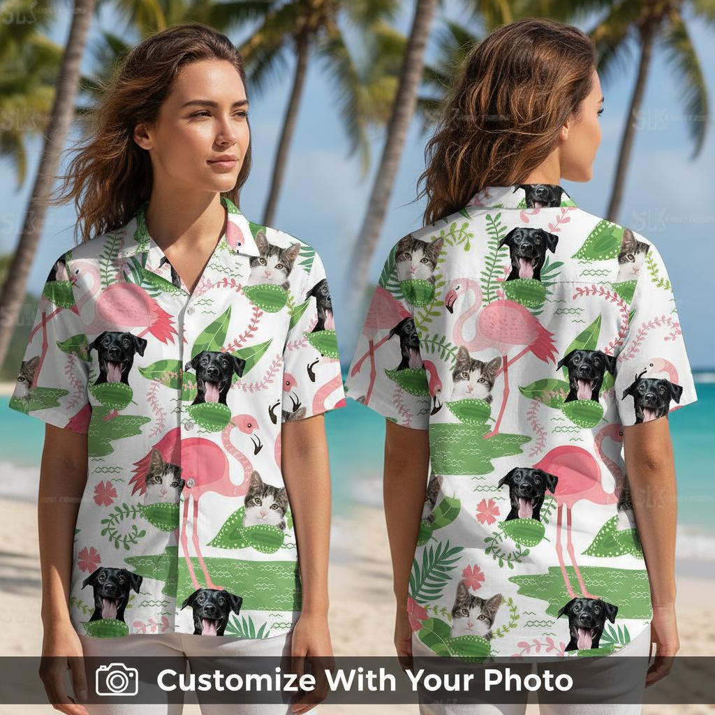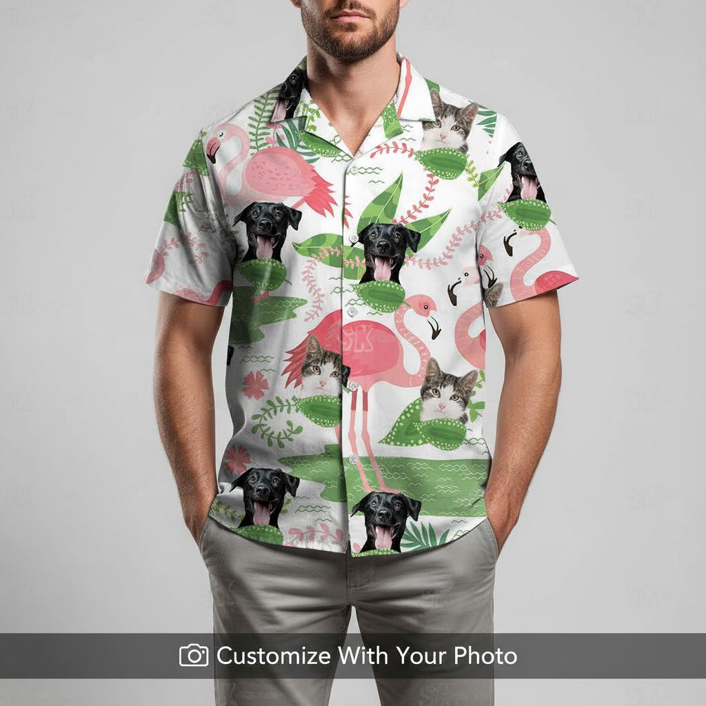 Cat Aloha Shirt Multi Pet Design with Custom Photo Print Flamingo Dogs