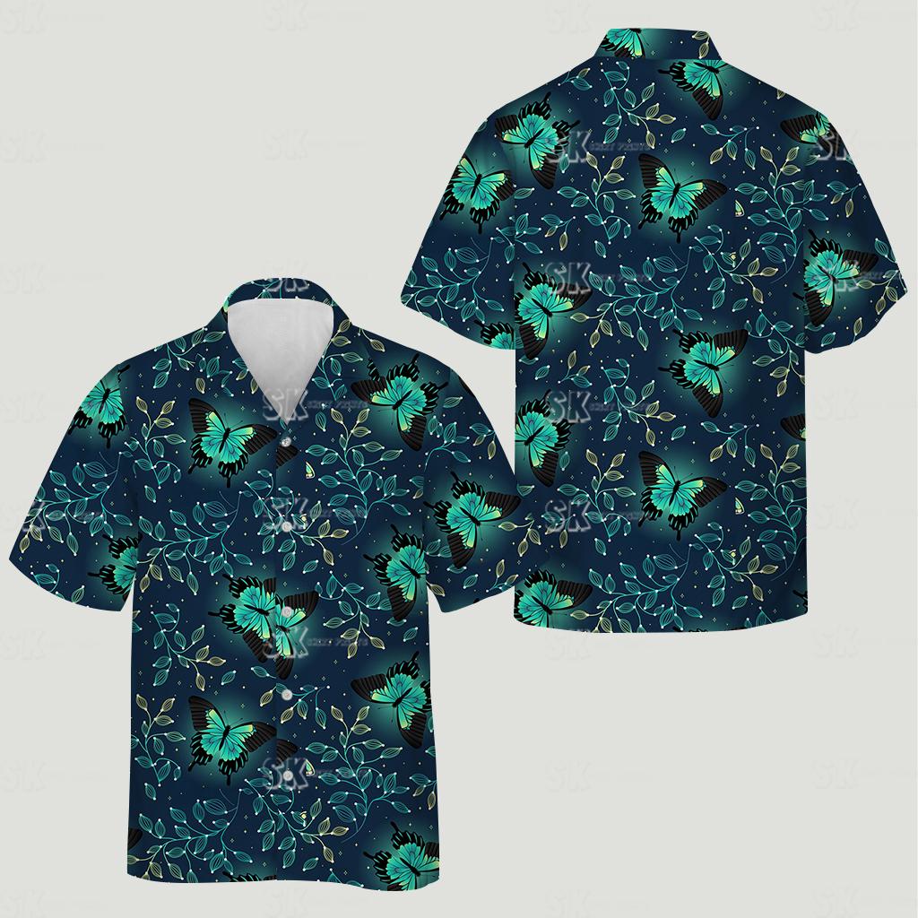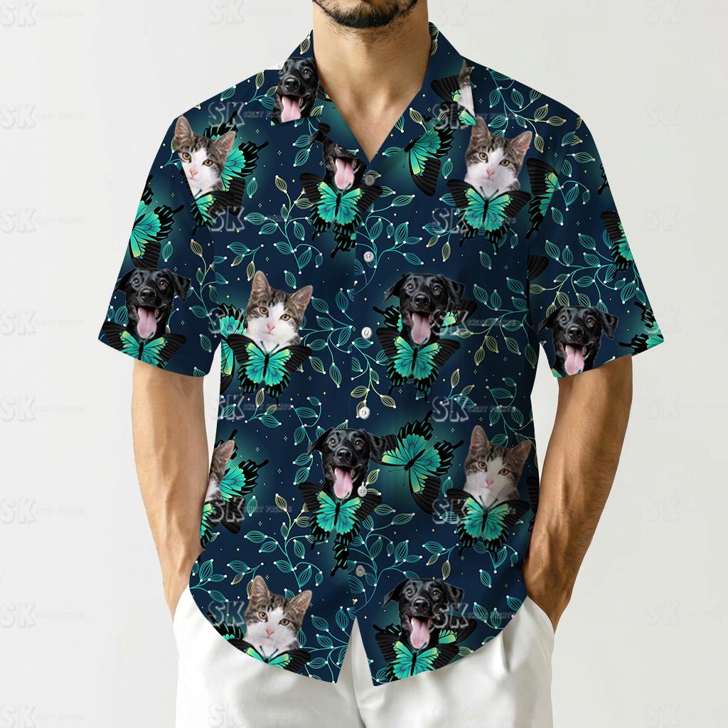 Cat Print Hawaiian Shirt with Dog Face and Butterfly Design