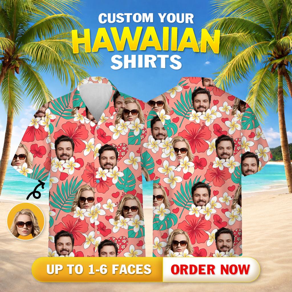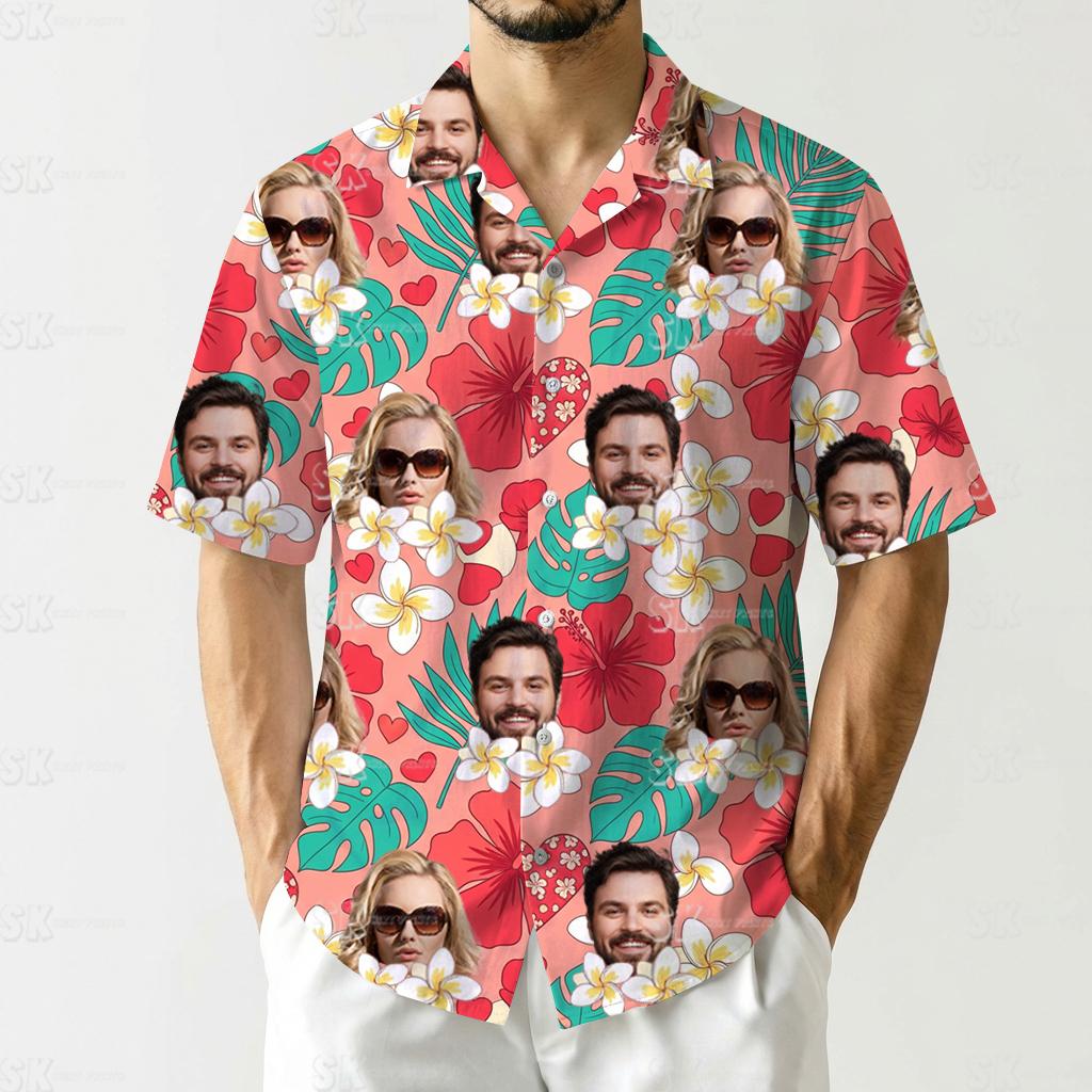 Imagine a tropical paradise captured in custom apparel. This couples matching tropical outfit showcases lush red hibiscus flowers, delicate white plumeria blooms, and large green leaves dancing on a pinkish coral background. Moreover, small red hearts add a delightful touch of romance. Topping it all off, your favorite faces are expertly blended into the artwork, making every shirt truly unique. For fun photos or vibrant parties, these matching couples Hawaiian shirts radiate joyful energy in every stitch.