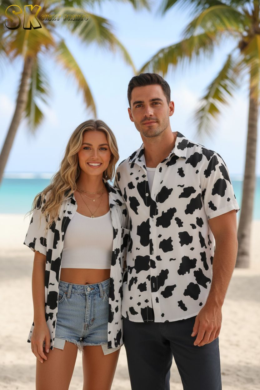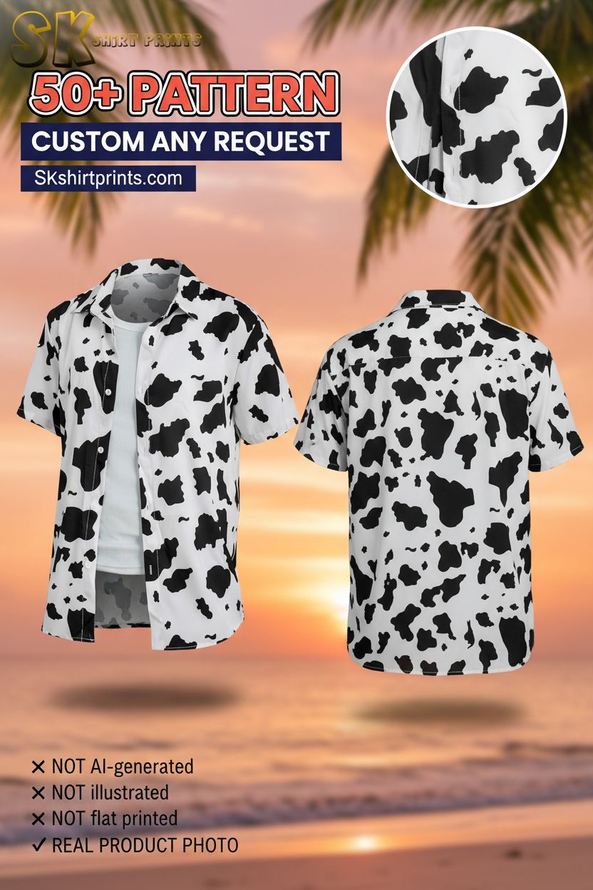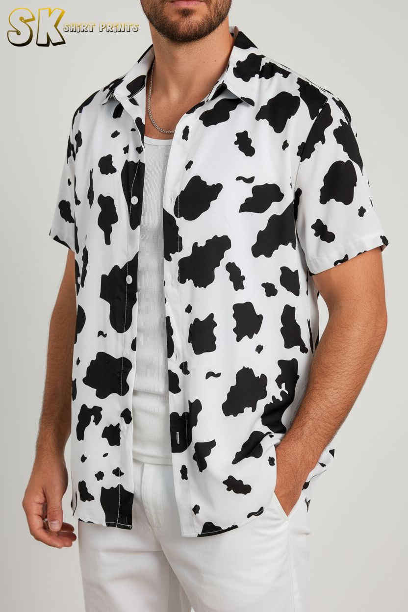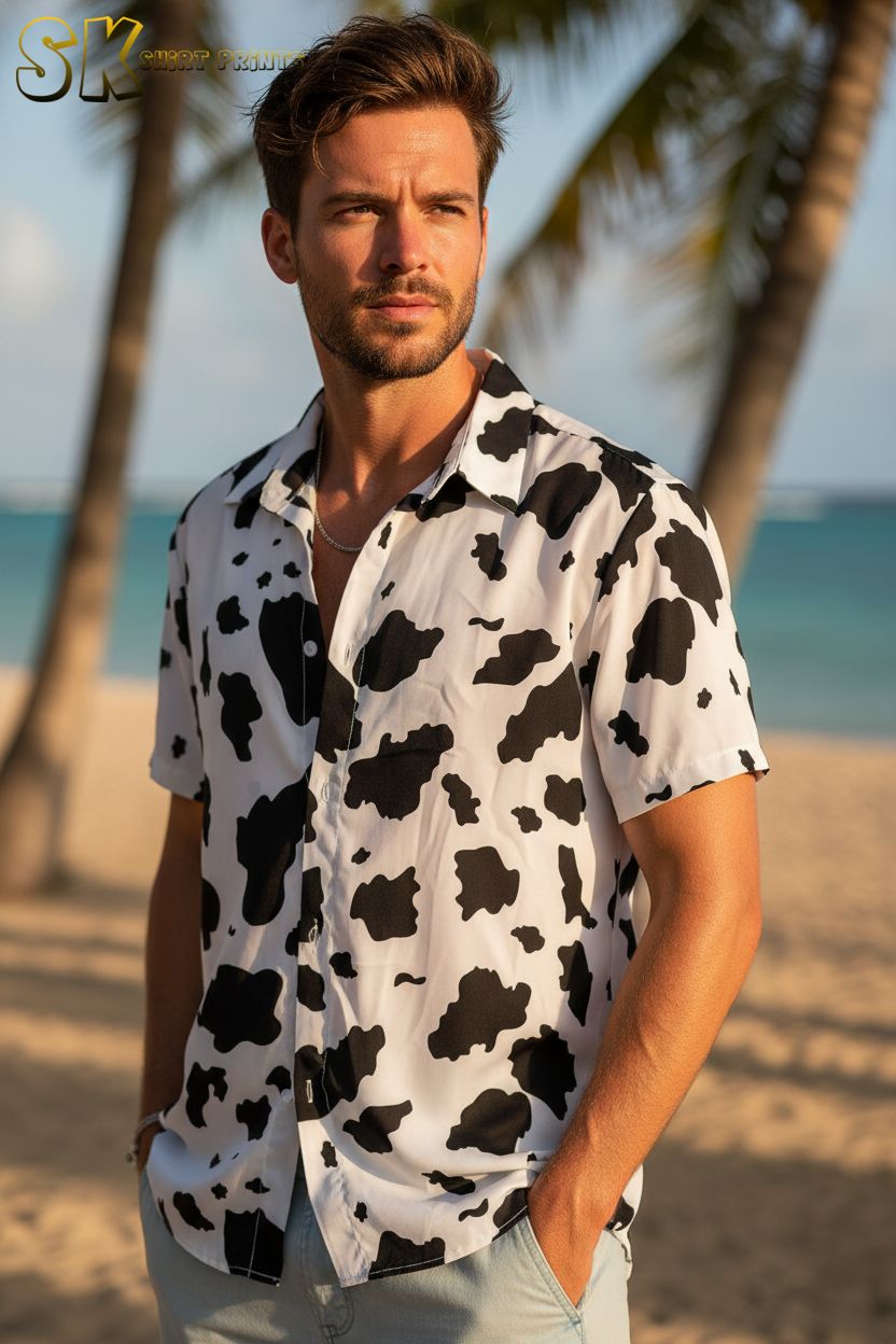 Cow Print Button Up Hawaiian Shirt – Tropical Beach Vacation Shirt for Men
