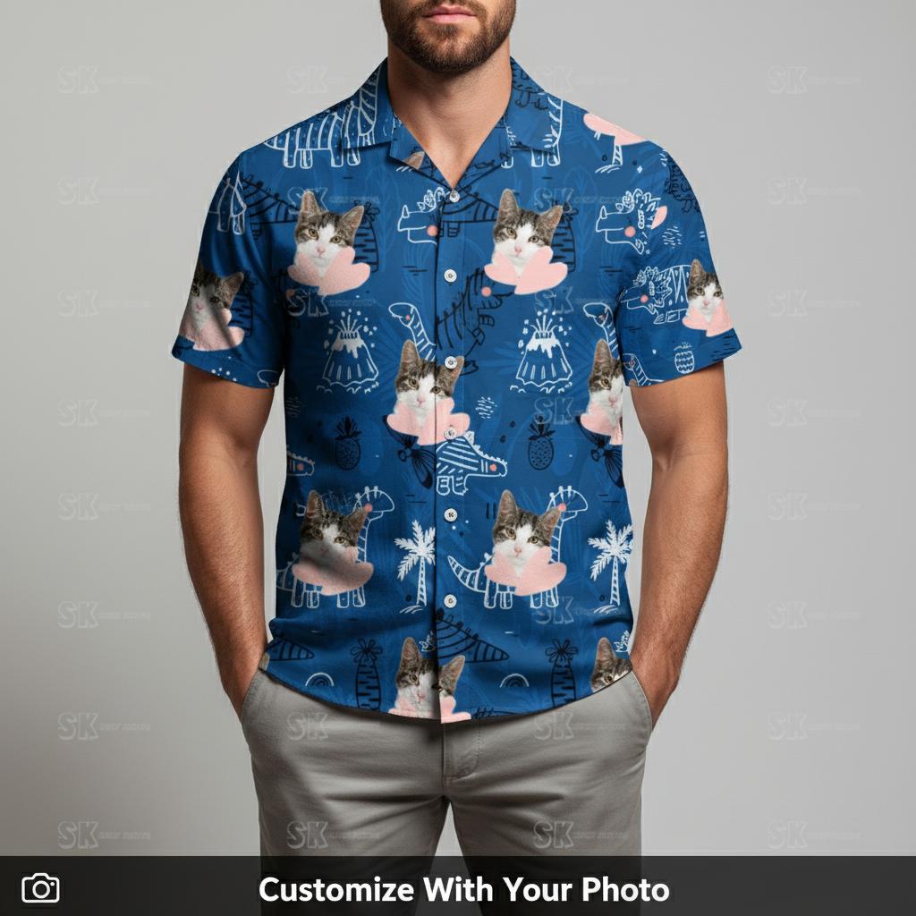 Dinosaur Hawaiian Shirt Custom Photo Blue Pattern with Cats