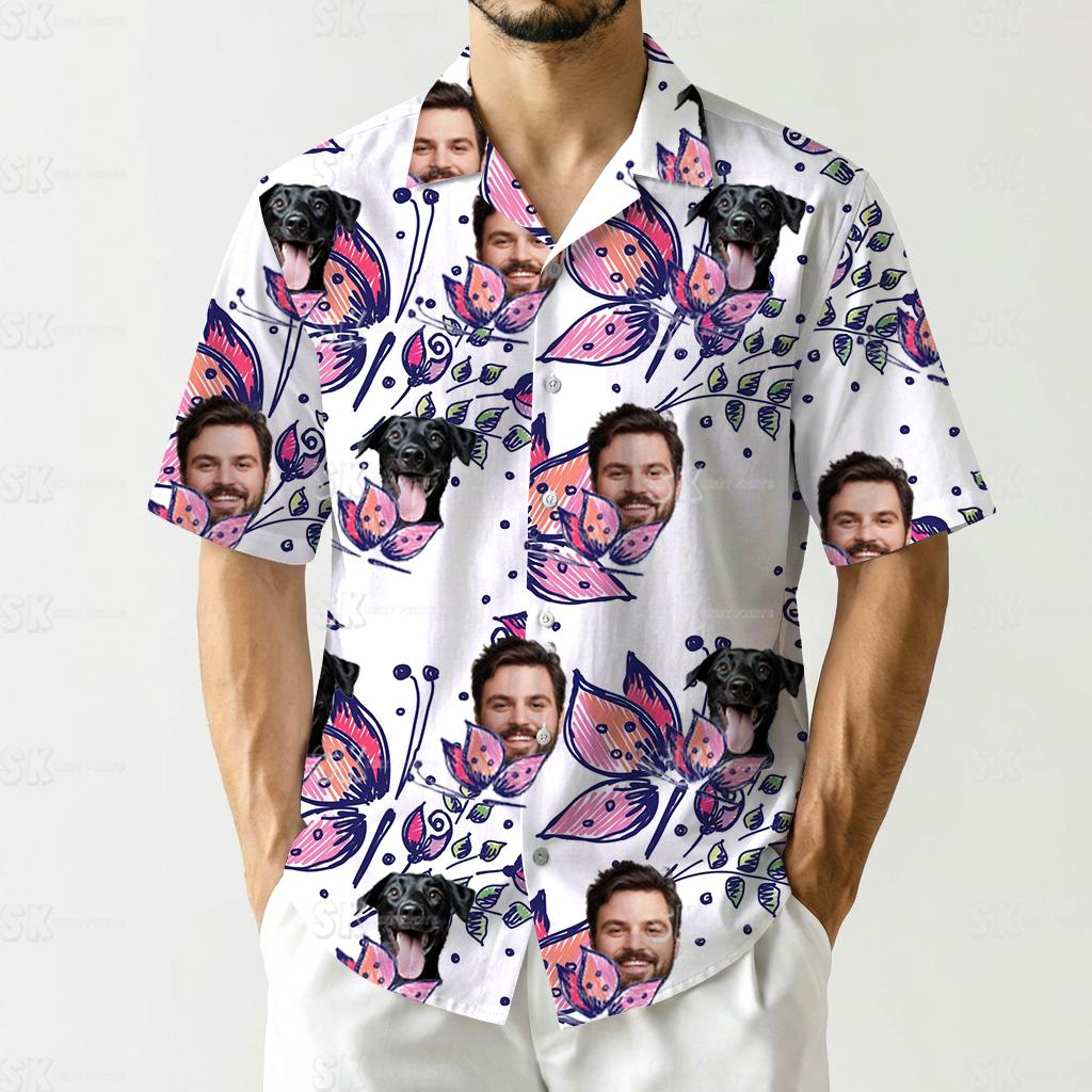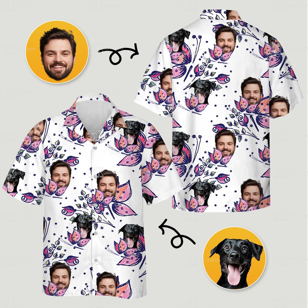 This dog Hawaiian shirt custom stands out with its lively pattern. Imagine a harmonious blend of illustrated pink and purple leaves swirling around captivating photos of your dog’s face—and maybe a family member, too. Every shirt bursts with personality and color. Consequently, the thoughtful design creates an instant conversation starter. Moreover, the whimsical combination of nature and your personal images ensures you get a shirt no one else owns. For instance, your corgi’s joyful face set against bright, playful leaves instantly sparks smiles wherever you go. Whether you’re walking on the beach or celebrating a special day, this shirt will shine with your story.