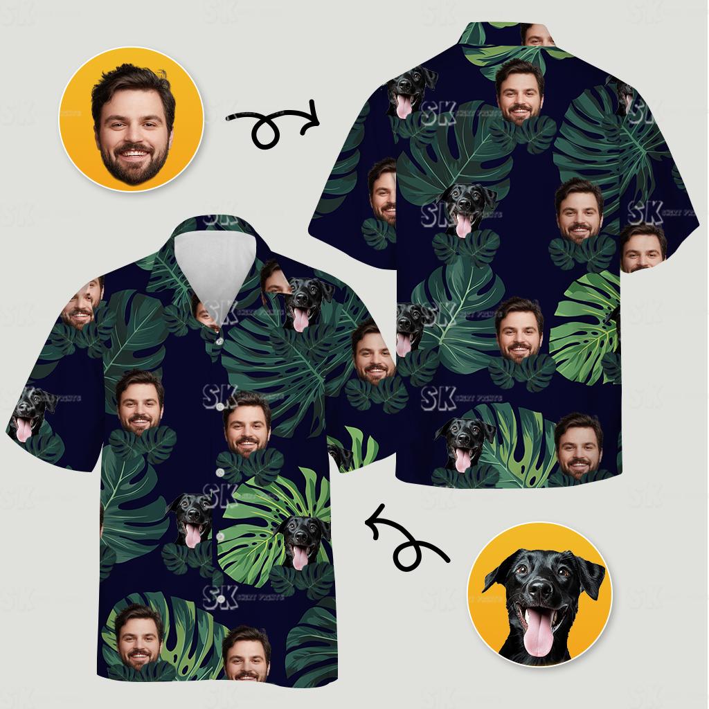 This custom Hawaiian shirt is more than clothing; it’s your story made wearable. Our design features oversized green Monstera leaves, large images of your dog’s face, and the face of a loved one, all set on a sleek dark background that ensures every detail stands out. For instance, the bold contrast makes the pattern leap out, catching light and drawing admiration. Your dog’s face appears playfully with its tongue out, adding joyful energy to each look. Moreover, the layout carefully arranges each element for balance and flow. Consequently, you get a piece that’s both lively and artful, perfect for turning ordinary days into memorable occasions.