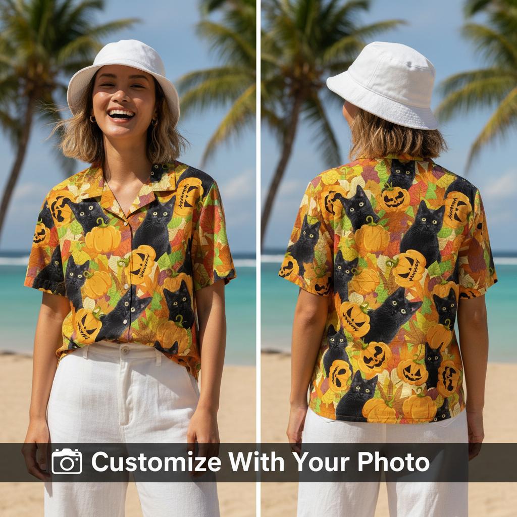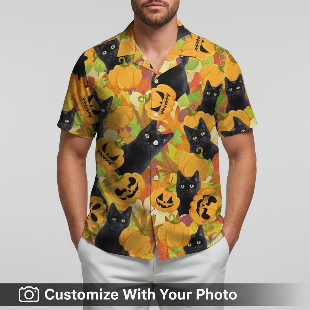 Halloween Cat Hawaiian Shirt Custom Photo Print – Spooky Black Cat Design