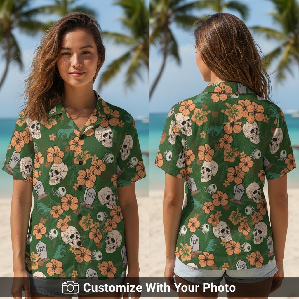 Halloween Skeleton Shirt Custom Photo Green Hawaiian Shirt Spooky Design