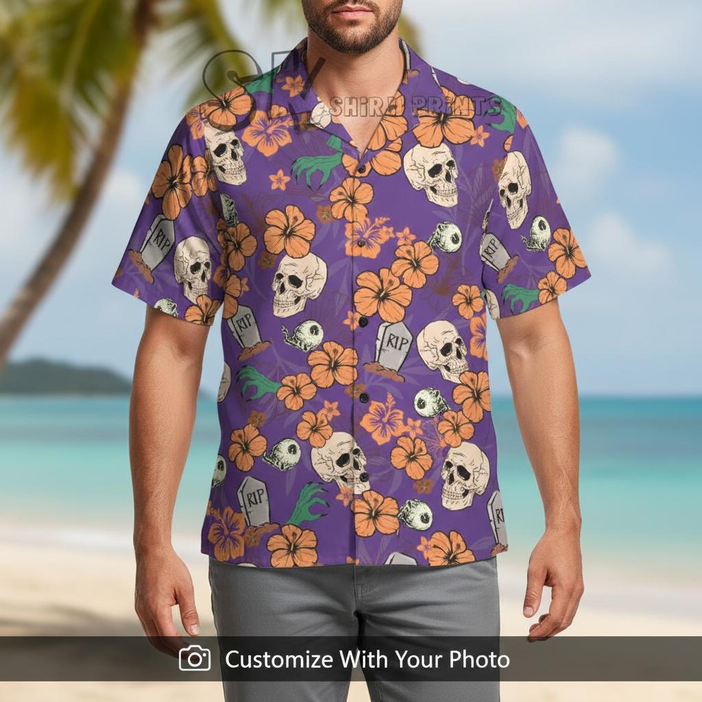 Halloween Hawaiian Shirt Custom Photo Skeleton Pattern Purple Spooky Tropical