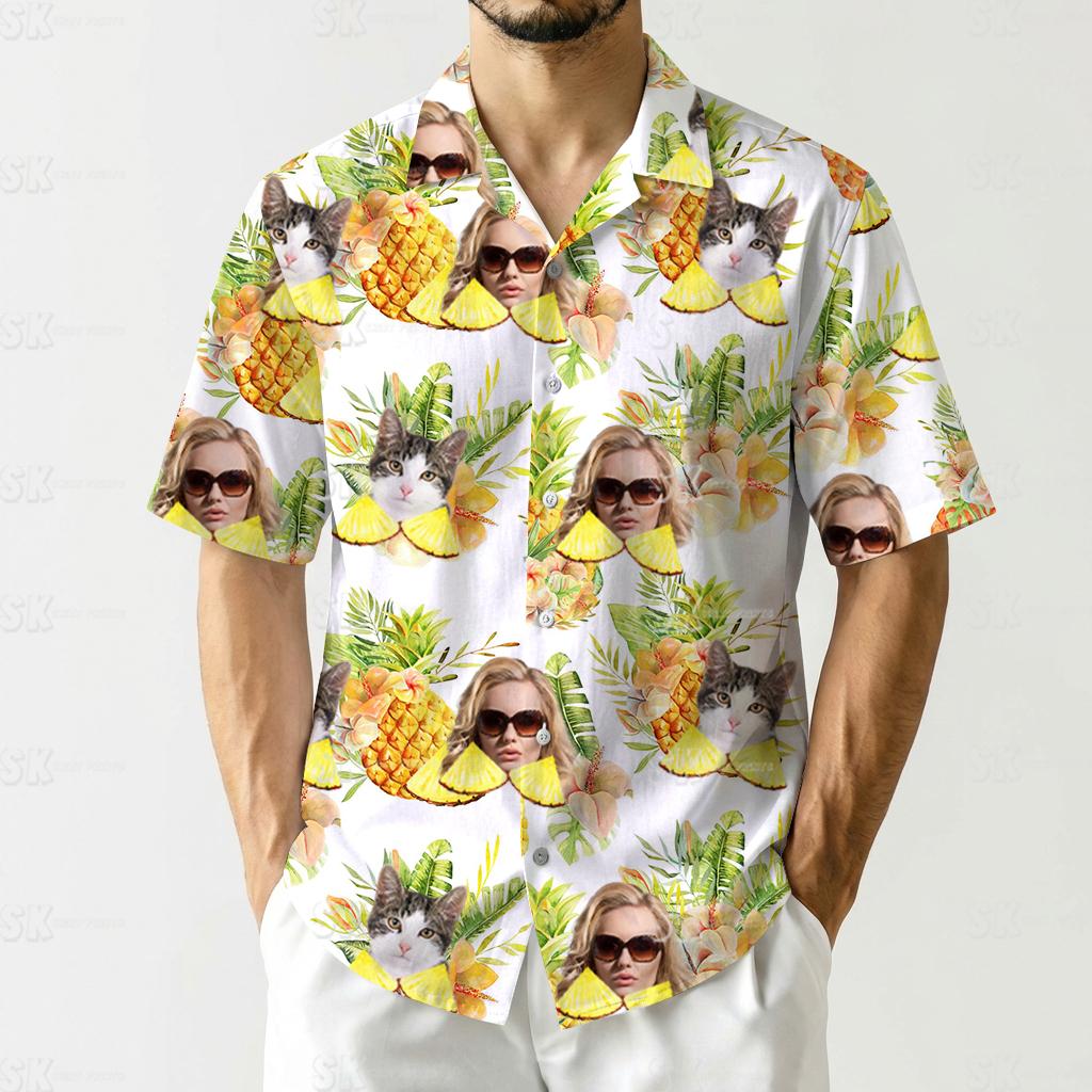 Cat ladies love putting their pets on the tropical background. Moms create family vacation shirts with everyone’s faces mixed into the pineapples. Beach wedding parties order matching ones with the bride and groom’s photos. It works for birthdays, reunions, or just because you want a unique Hawaiian shirt that nobody else has.