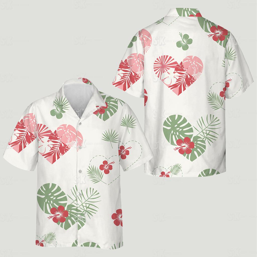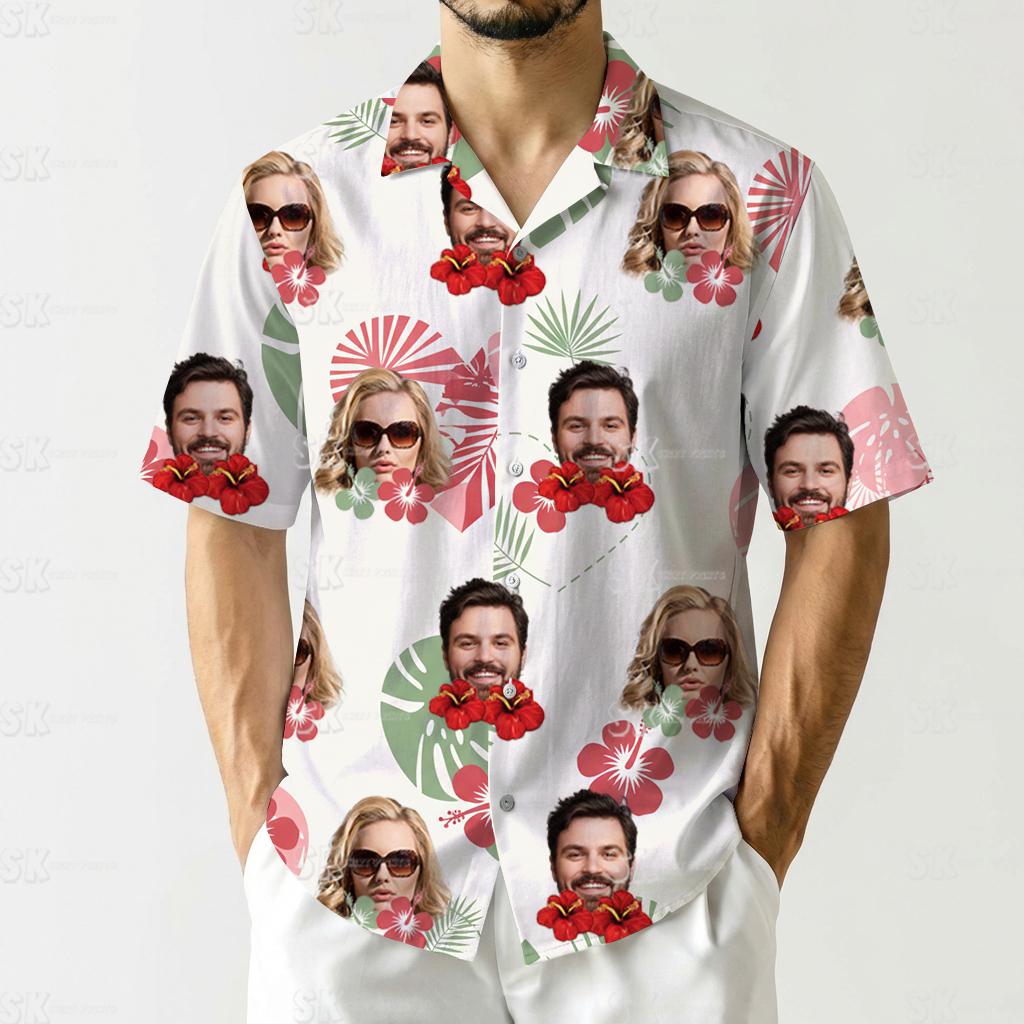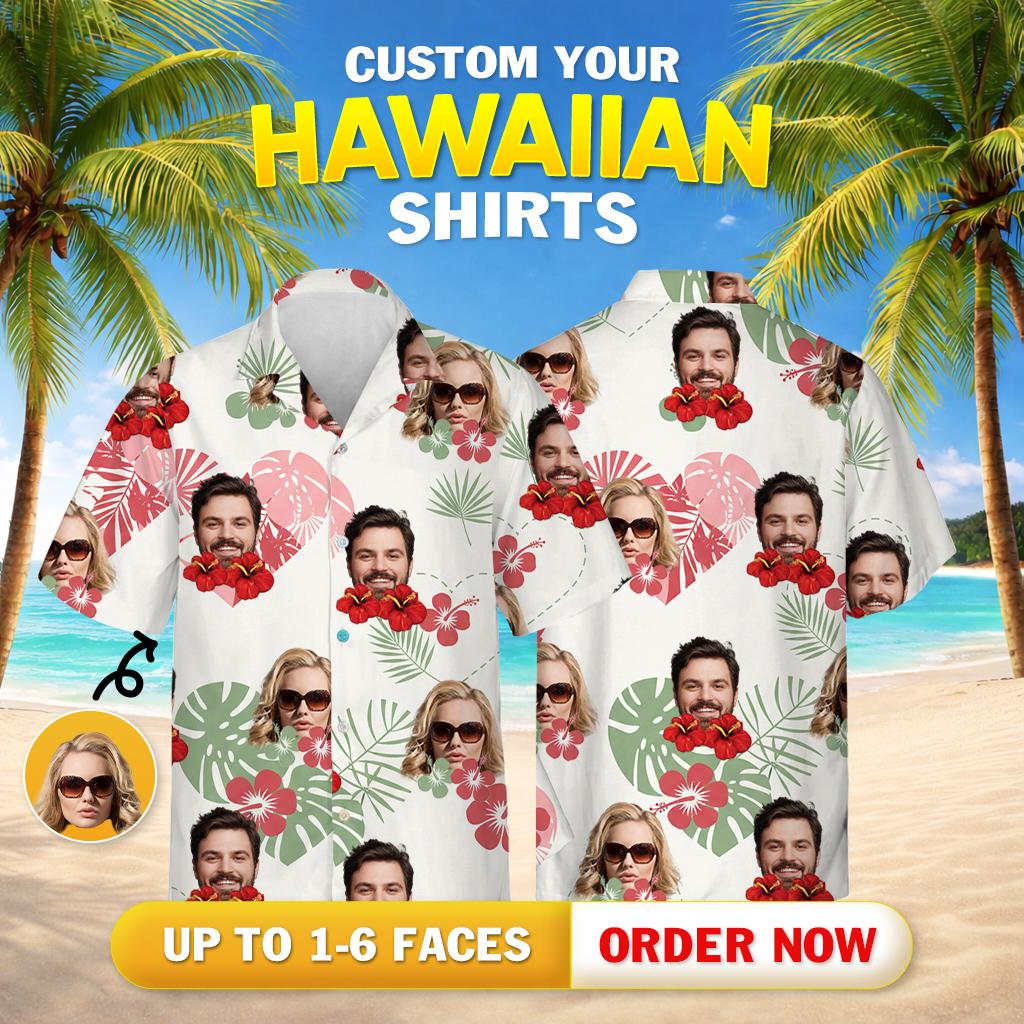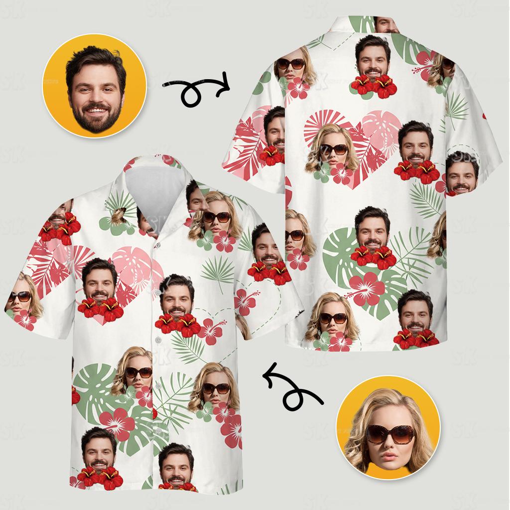 Our Hawaiian matching couple outfits are a true testament to creativity and joy. The shirt bursts with personality, featuring a collage of your chosen faces—expertly blended among classic hibiscus blossoms and large palm leaves. Each shirt tells a story, framed with playful hearts and layered in an energetic palette of green, red, and pink. When you and your partner wear these vibrant shirts, you’ll radiate fun and unity at luaus, on vacations, or any event where matching tropical outfits for couples shine.