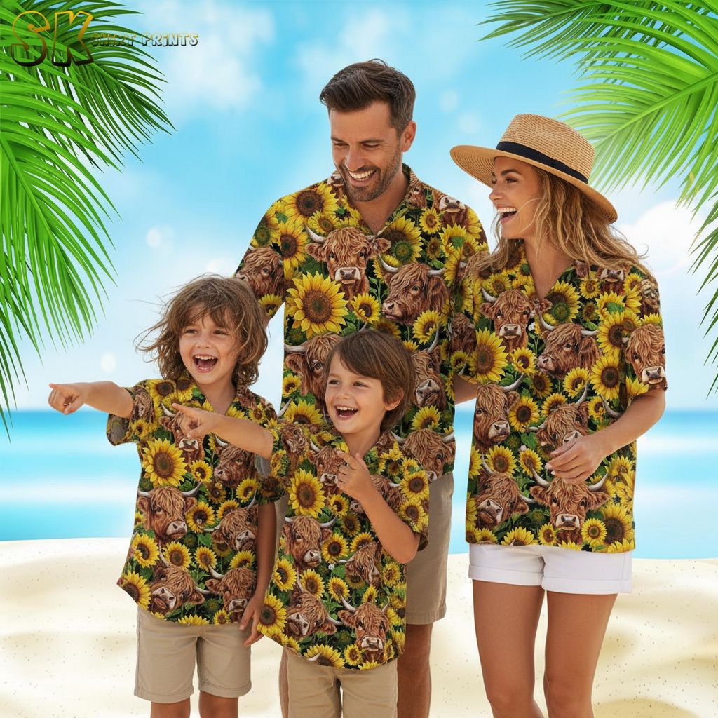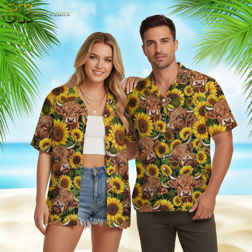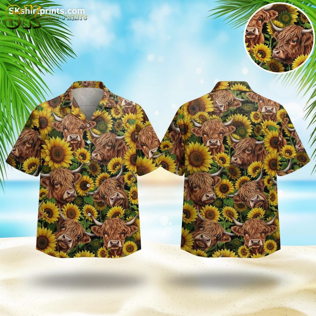 Highland Cow Sunflower Hawaiian Print Button Down Shirt for Men