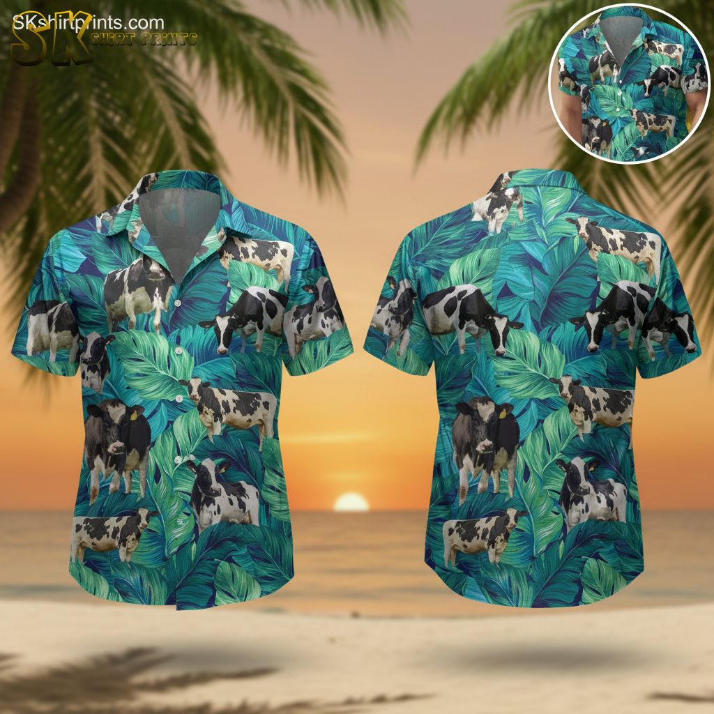 Men’s Cow Print Hawaiian Shirt – Black White Animal Pattern Button Down Short Sleeve