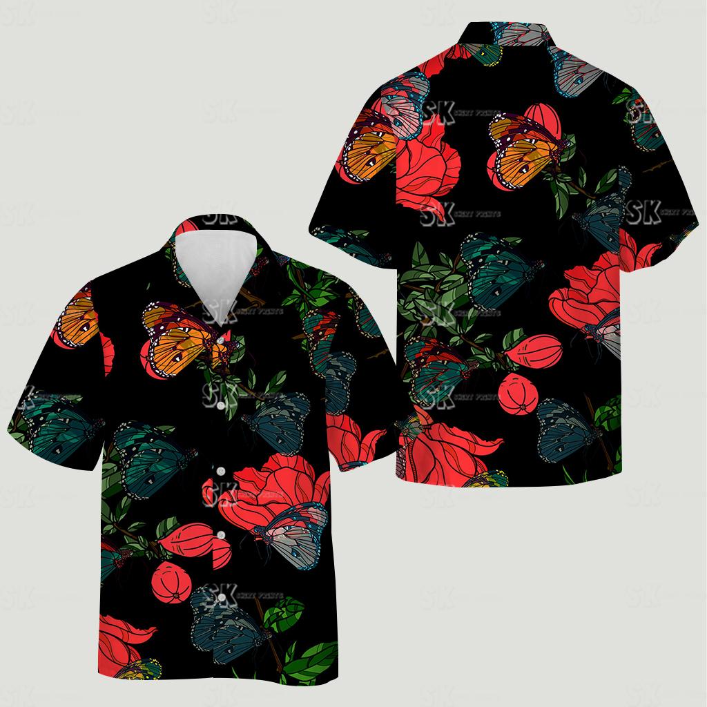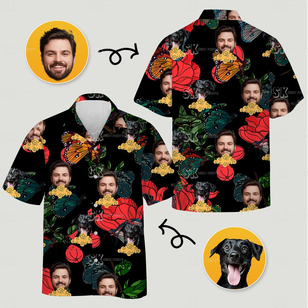 This men’s Hawaiian shirt immediately catches the eye with its dynamic, colorful pattern. A deep black background makes every detail pop, drawing attention to the custom faces, playful dogs, vivid butterflies, and blooming red roses. Moreover, swirling yellow accents weave through the design, adding a touch of movement and energy. For instance, your chosen faces blend seamlessly into the lively composition, making each shirt a one-of-a-kind masterpiece that stands out at any event.