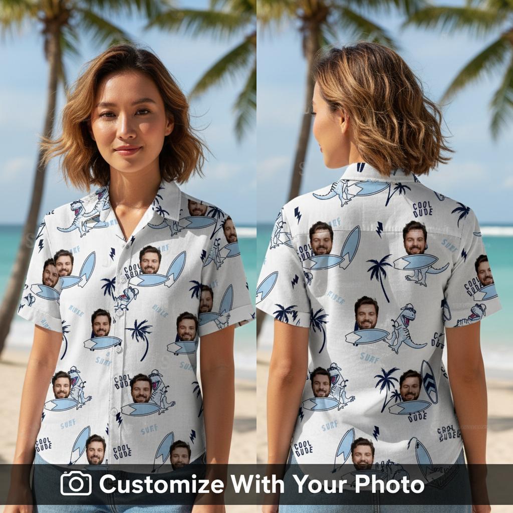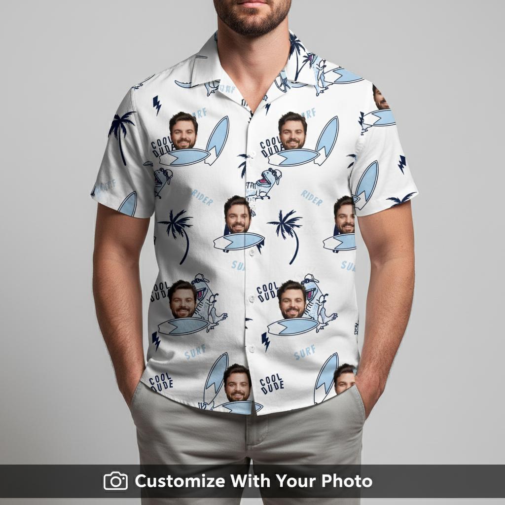 Mens White Hawaiian Shirt Custom Face Dinosaurs Surfboards Tropical Pattern