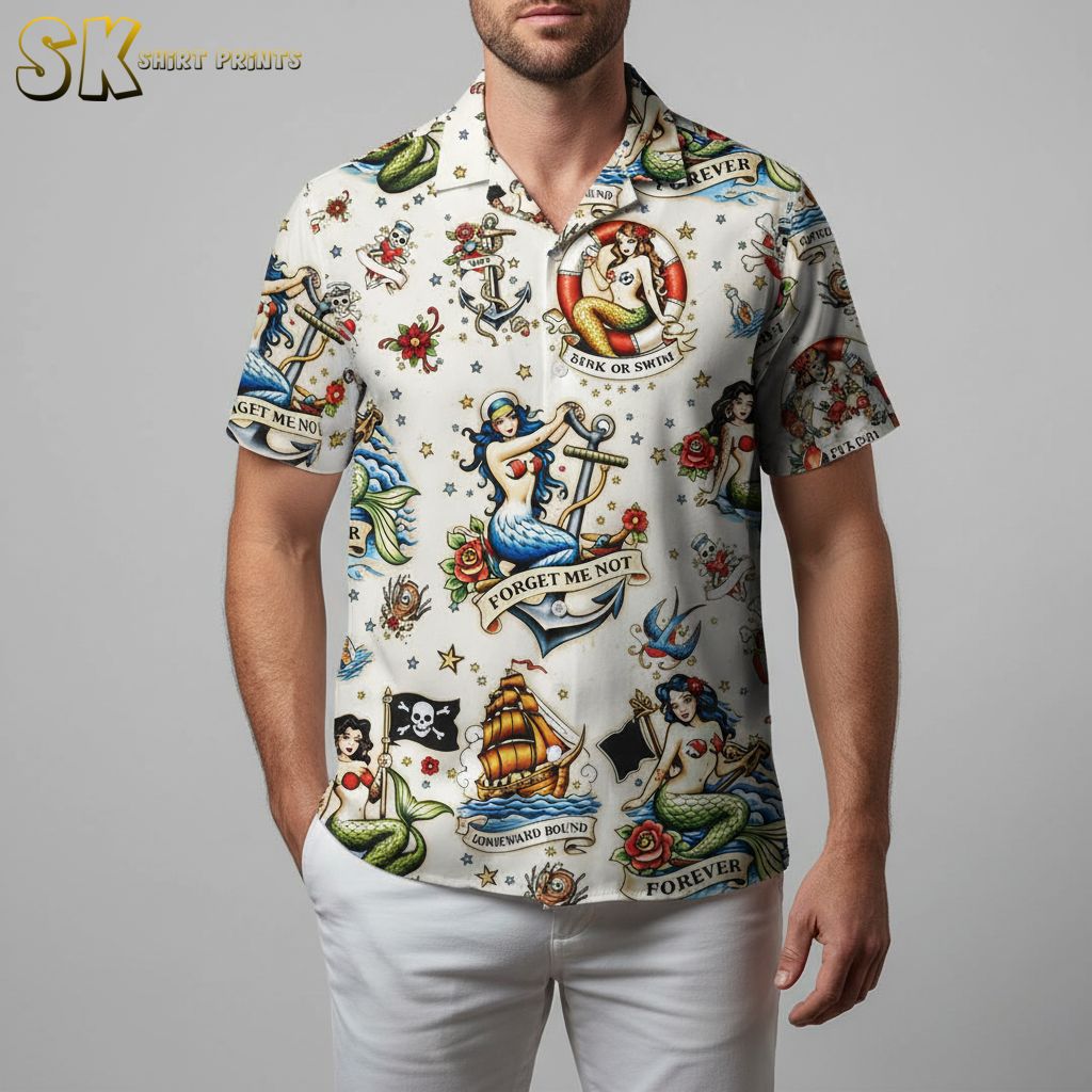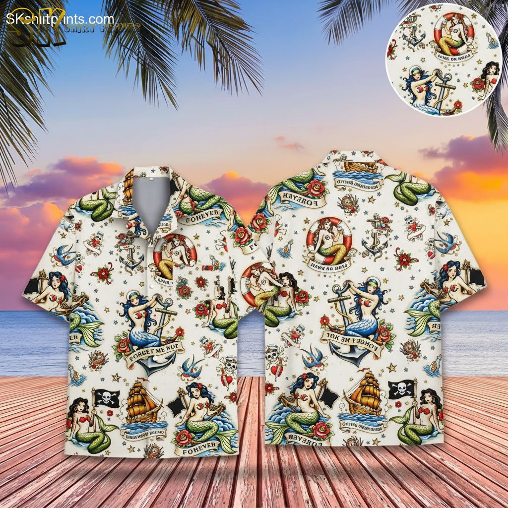 Nautical Tattoo Pirates of the Caribbean Hawaiian Shirt – Vintage Anchor Mermaid Button Up