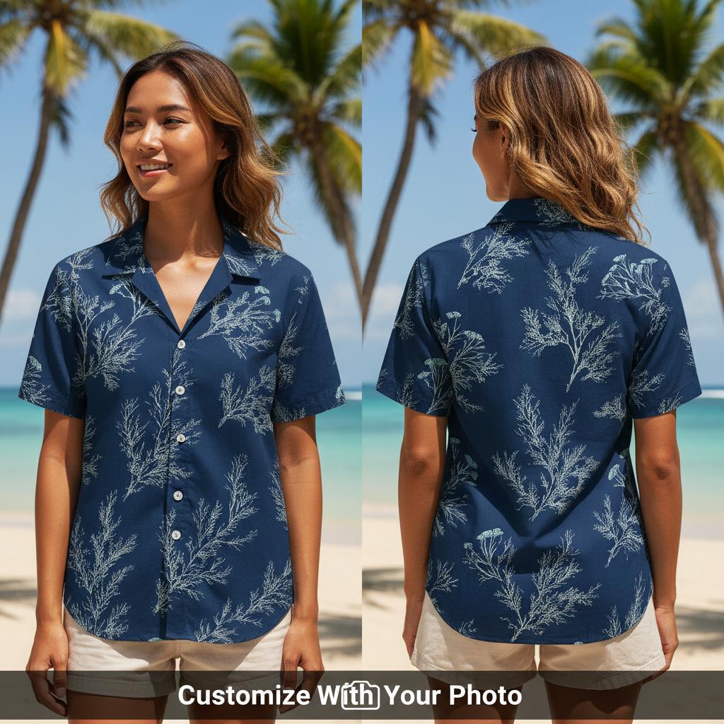 Navy Blue Hawaiian Shirt Custom Photo Coral Tropical Print Design