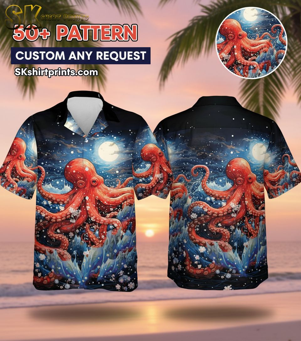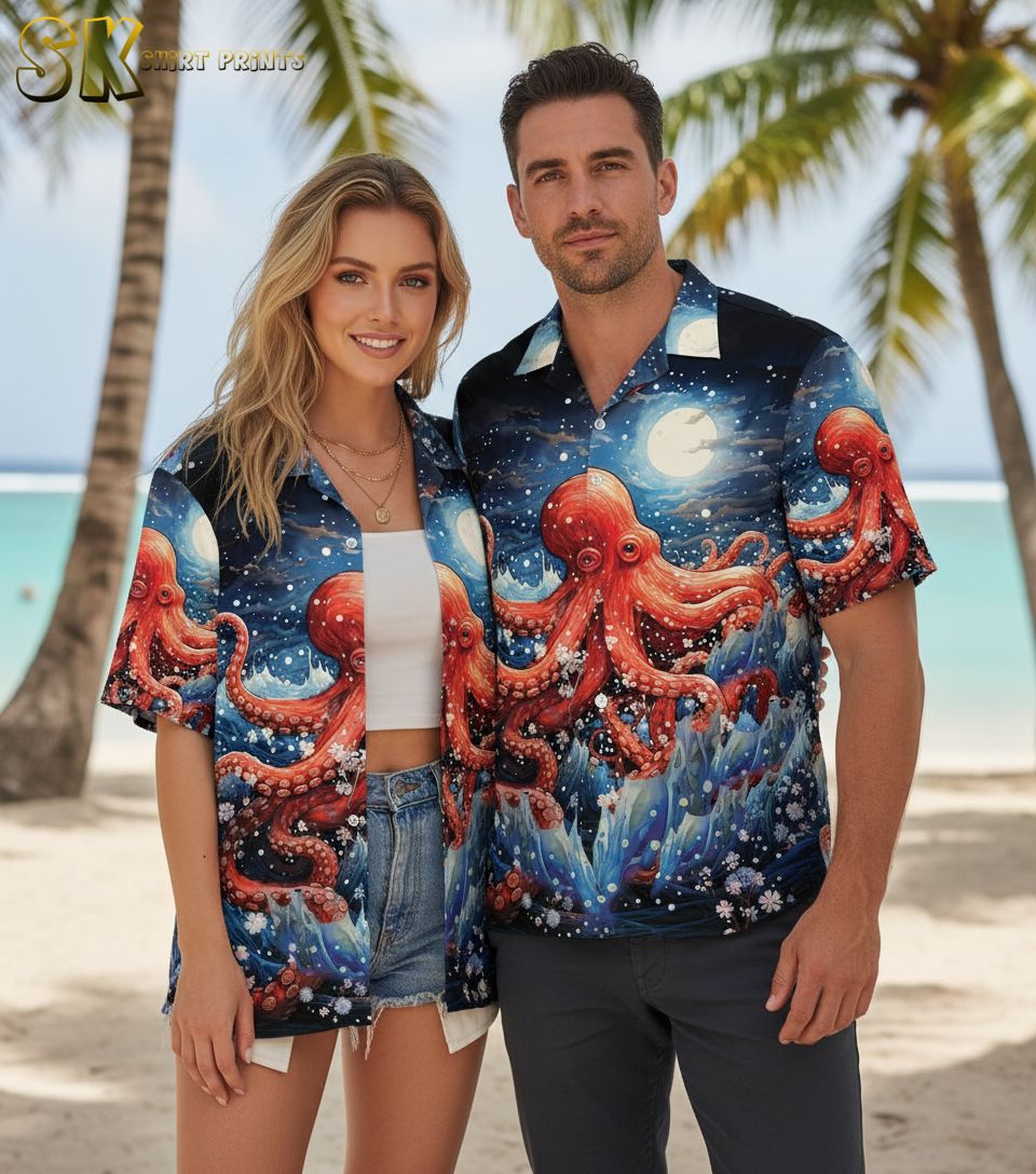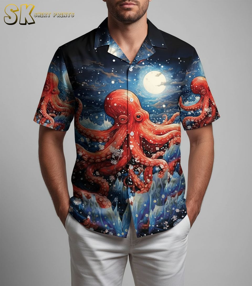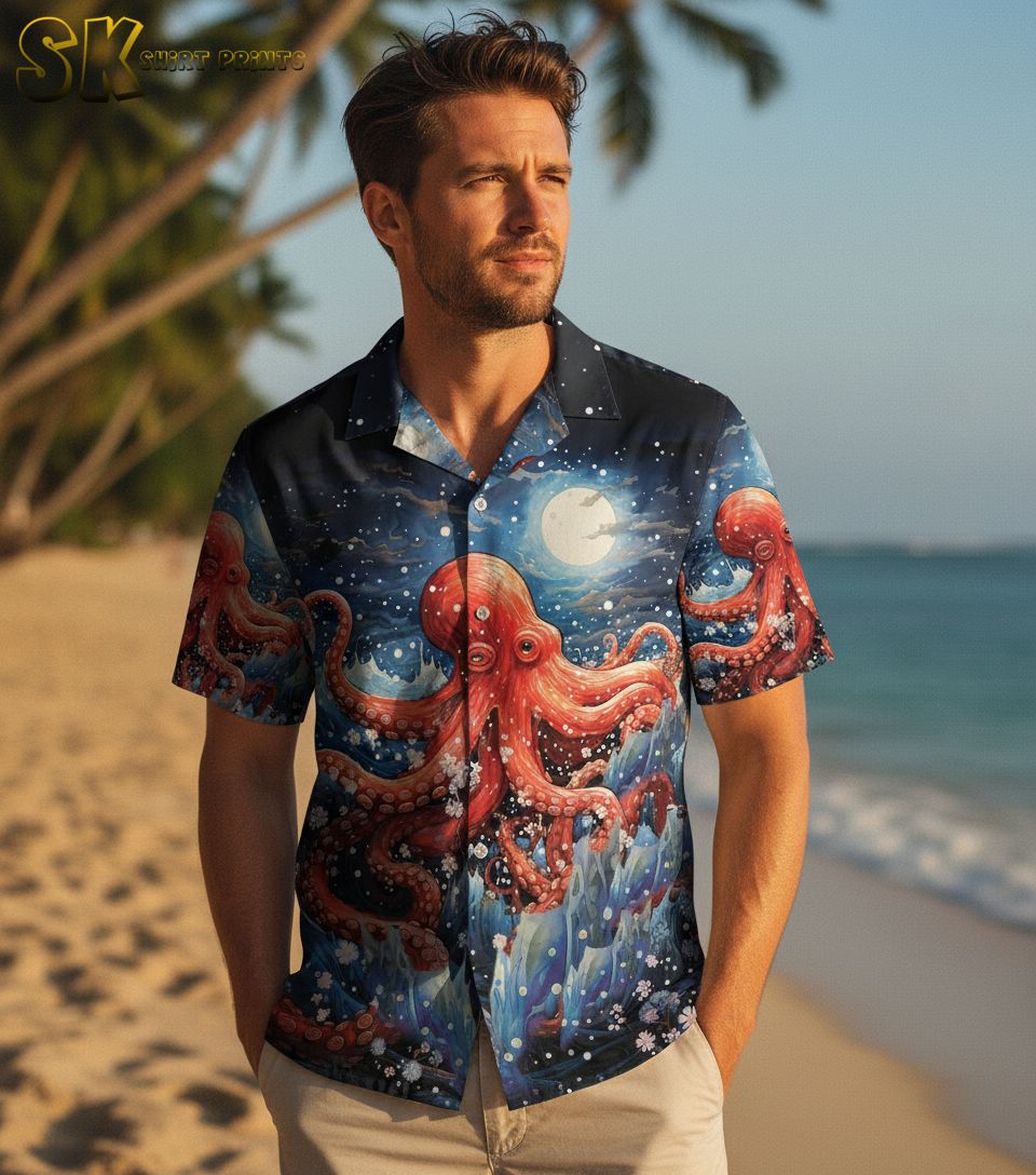 Octopus Hawaiian Sleeve Shirts Vacation Hawaiian Shirt – Deep Sea Print Button Down Beach Shirt for Summer