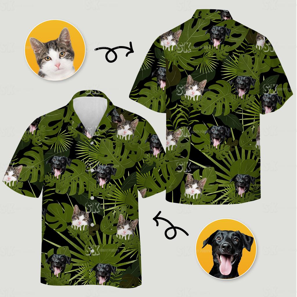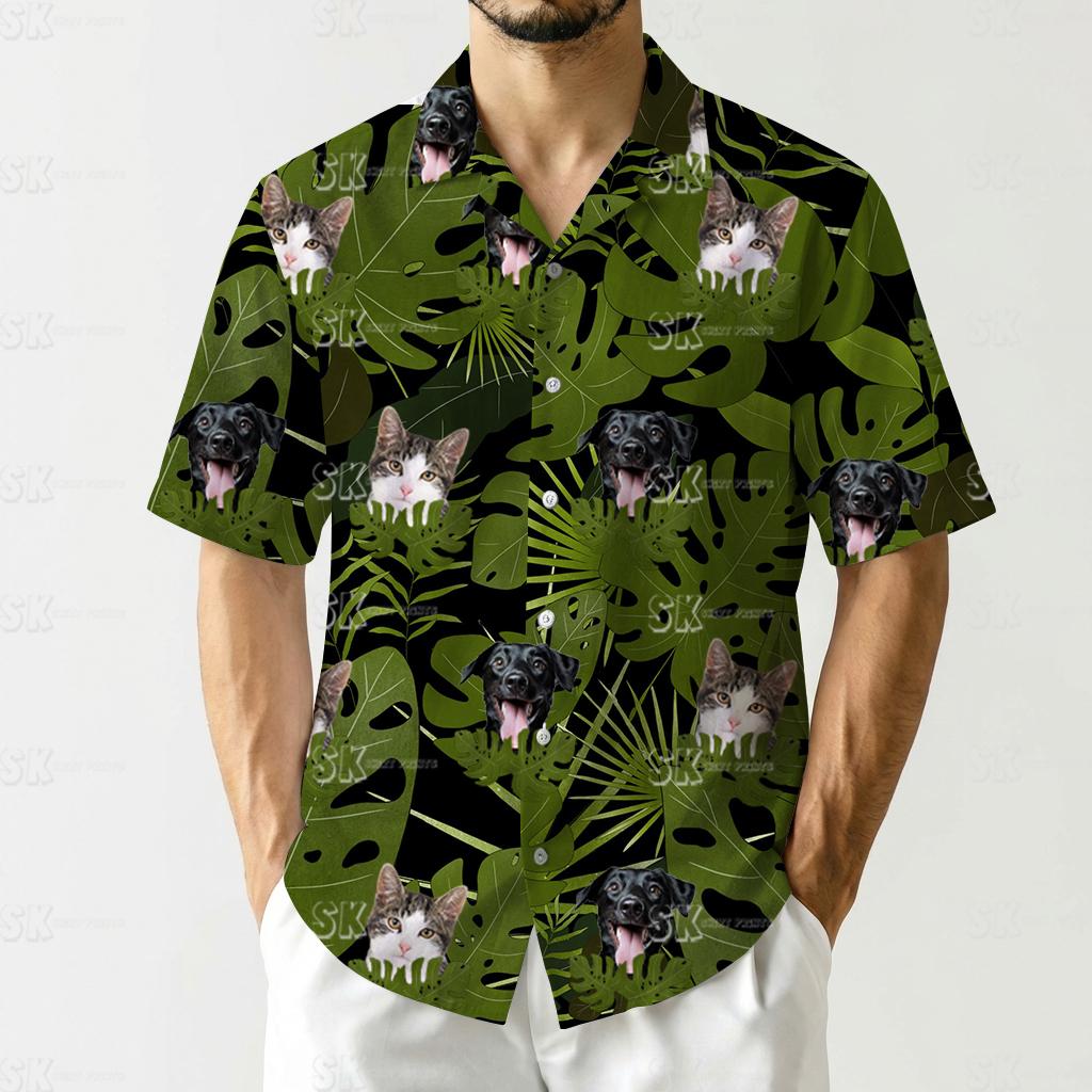 This design combines large green monstera and palm leaves on a dark background with your custom pet photos printed throughout. Your personalized cat hawaiian shirt becomes a wearable tribute to your furry friends mixed with tropical style.