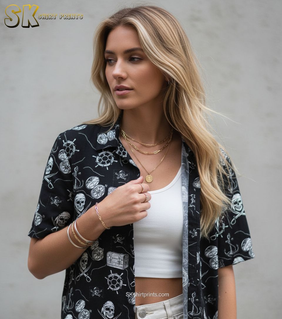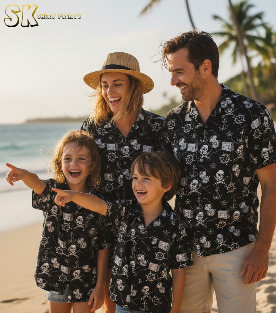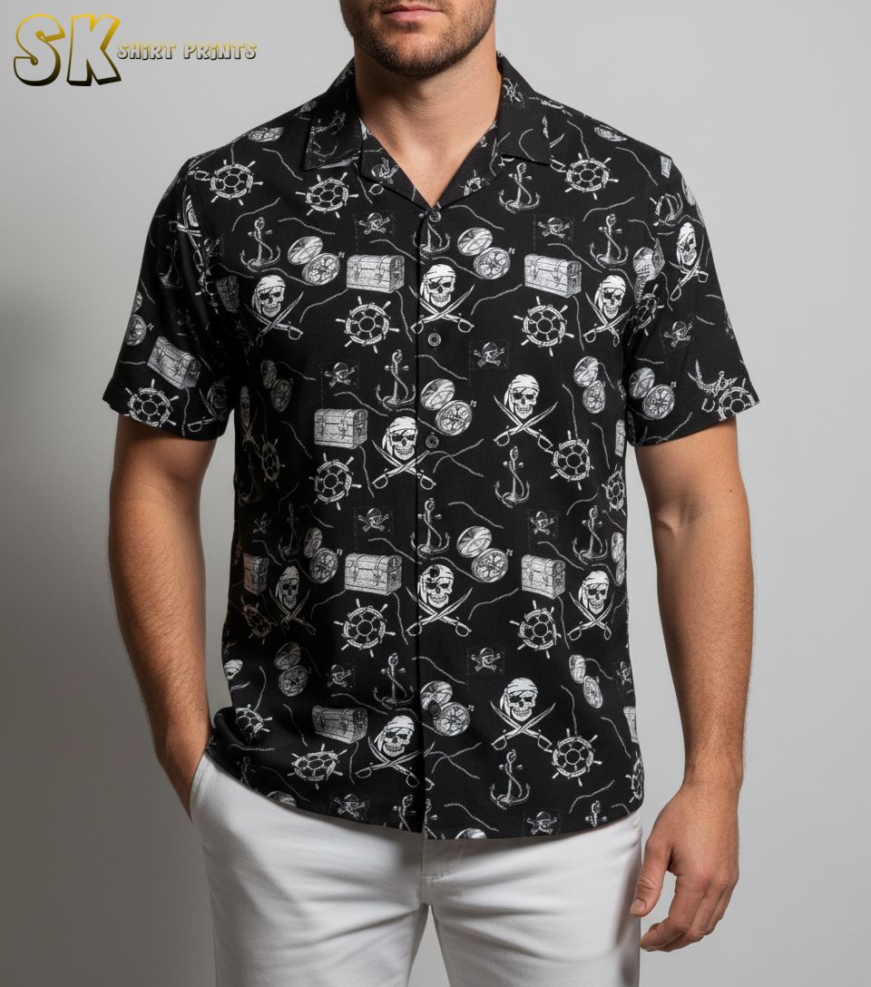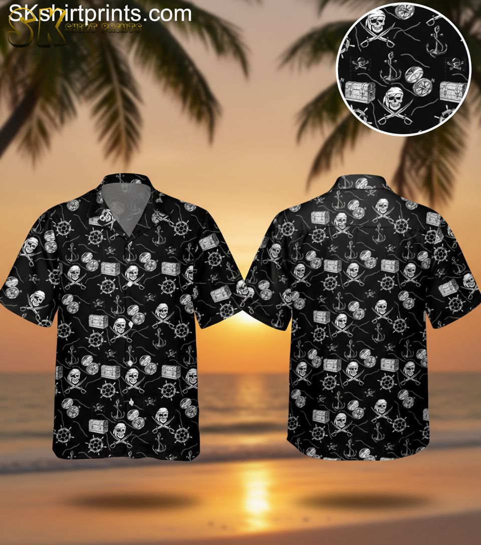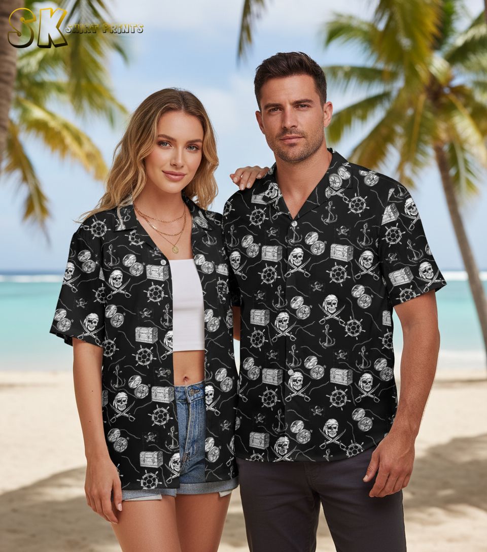 Pirate Skull Hawaiian Shirt for Men Women – Black Treasure Map Button Down Short Sleeve Aloha Shirt