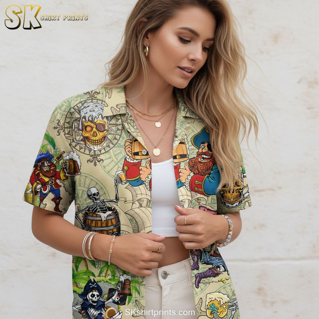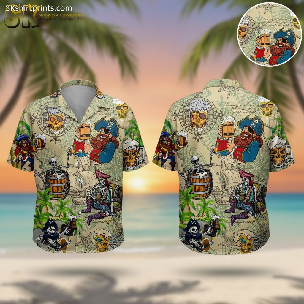 Pirate Skull Hawaiian Shirt For Men – Treasure Chest Beer Drinking Skeleton Button Down Short Sleeve