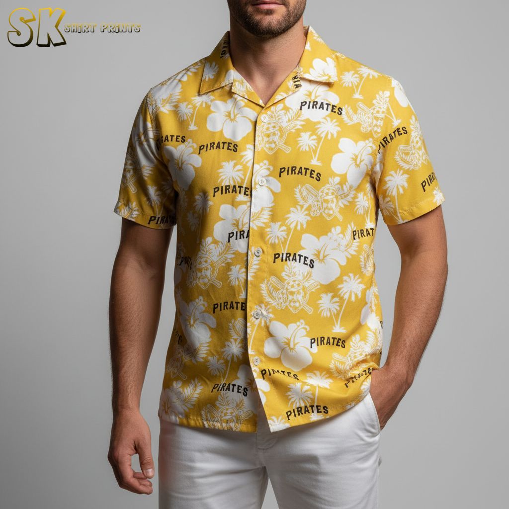 Pittsburgh Pirates Hawaiian Shirt - Tropical Hibiscus & Palm Tree Print with Pirates Logo