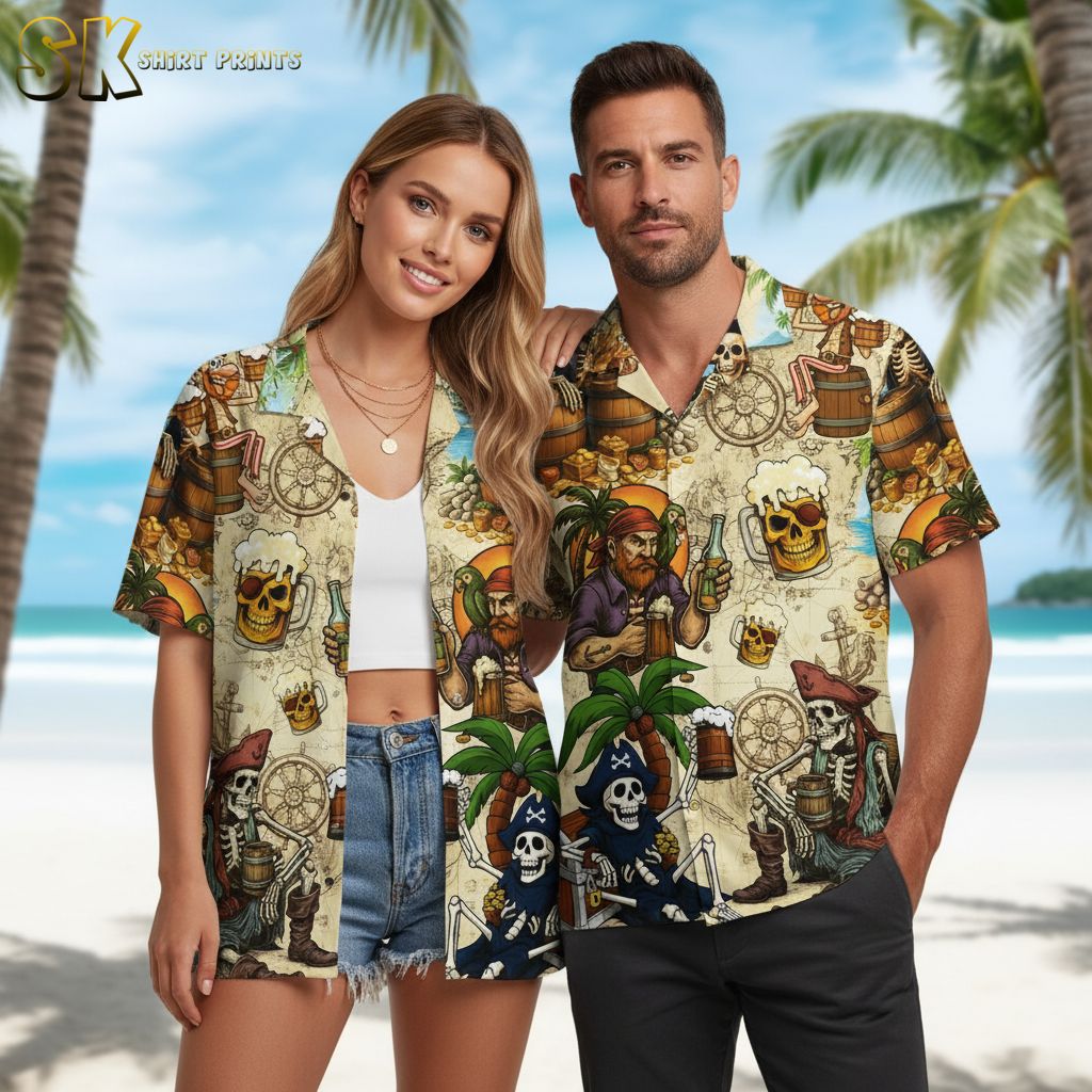 Skeleton Pirate Hawaiian Shirt For Men Women – Treasure Chest Drinking Beer Button Down Short Sleeve