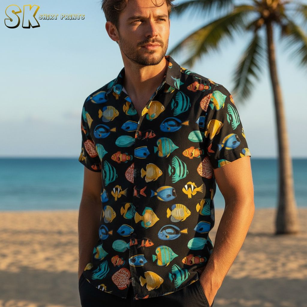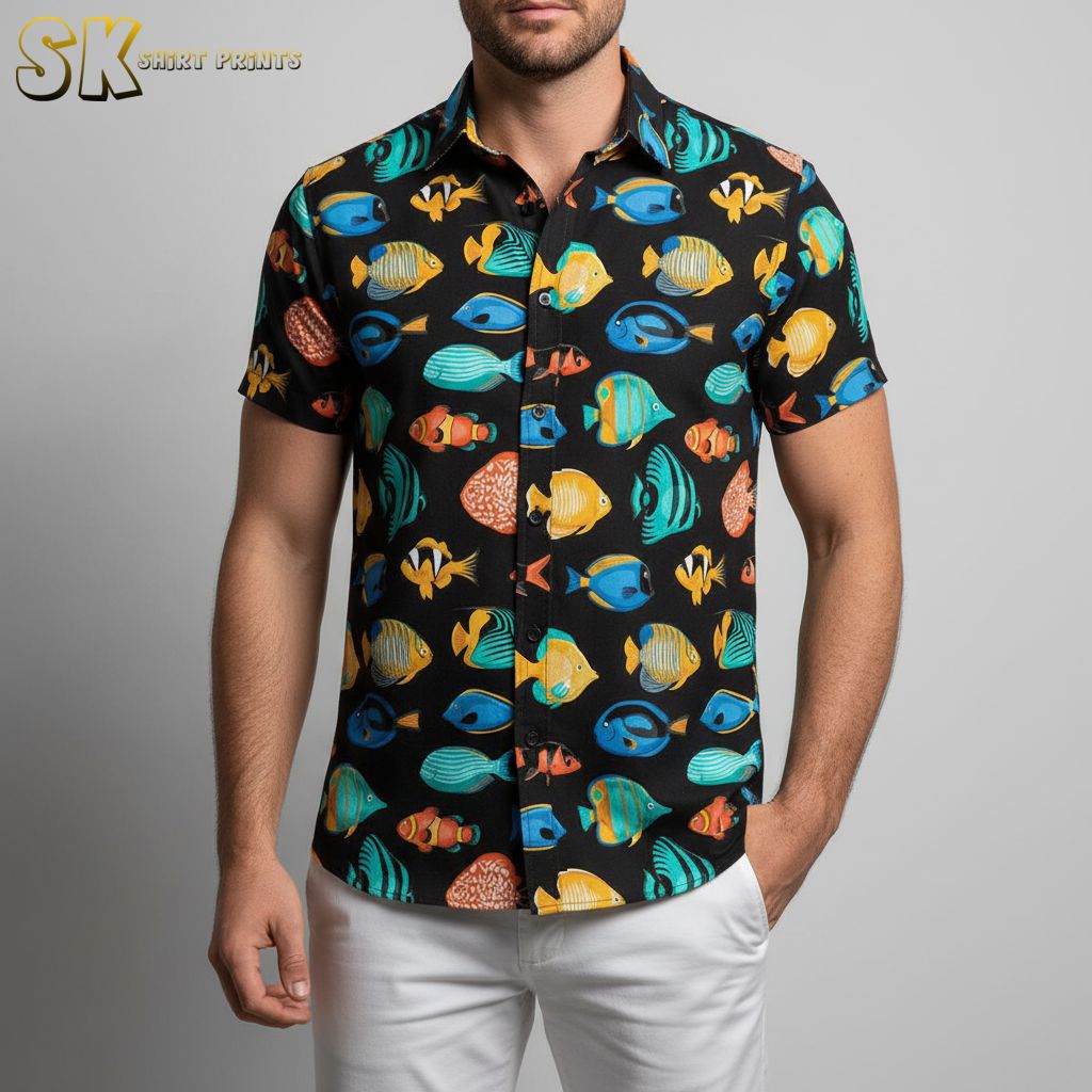 Tropical Fish Print Hawaiian Shirt – Men’s Button Down Short Sleeve Summer Casual Aloha Shirt