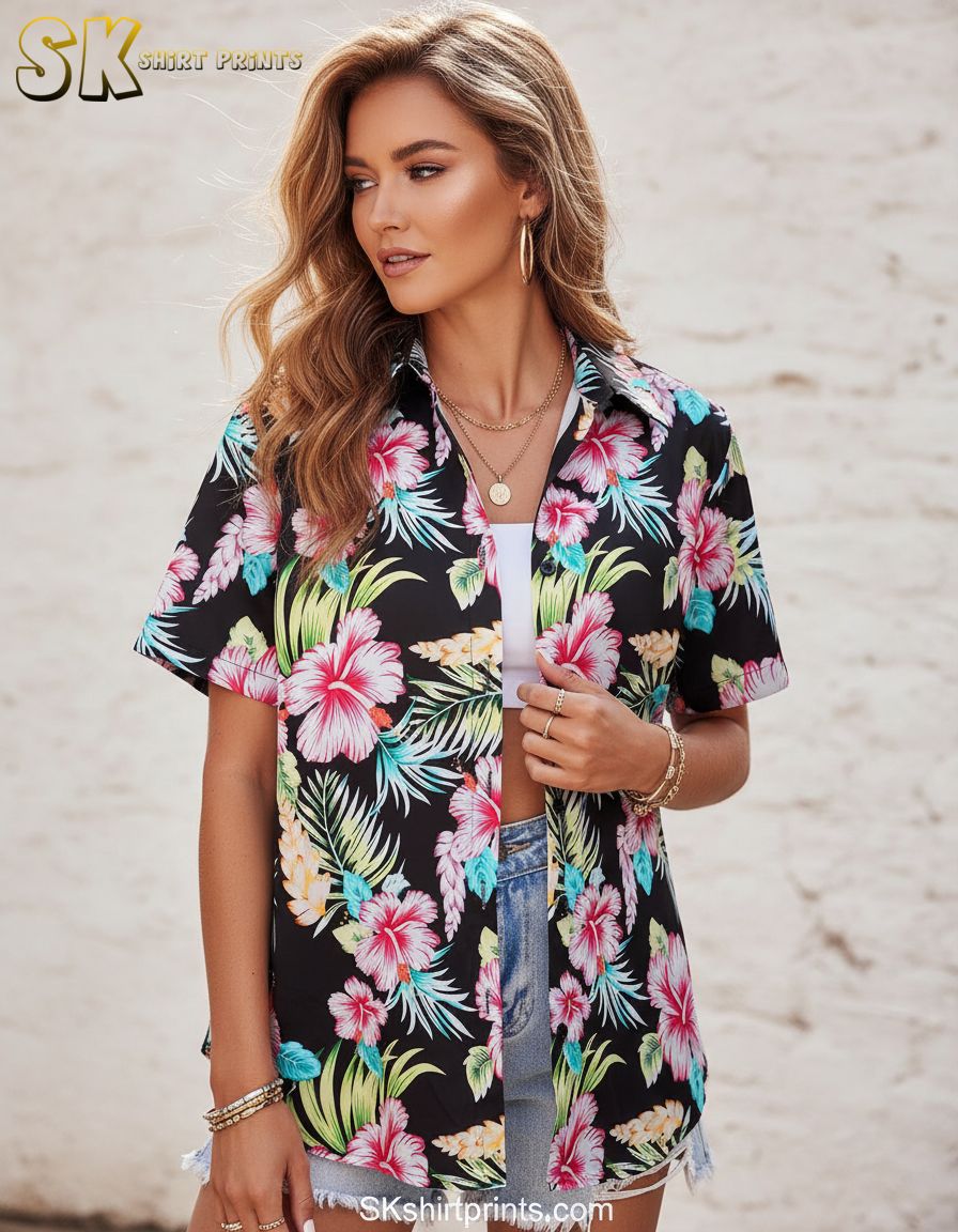 Women Hawaiian Shirt Soft Cool Summer Tropical Beach Shirts Floral Print V Neck Short Sleeve Button Up Blouse