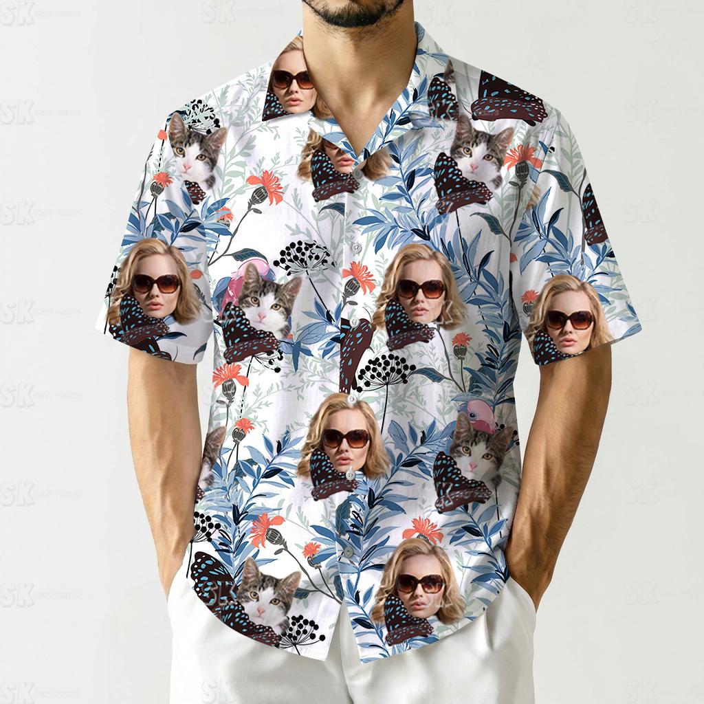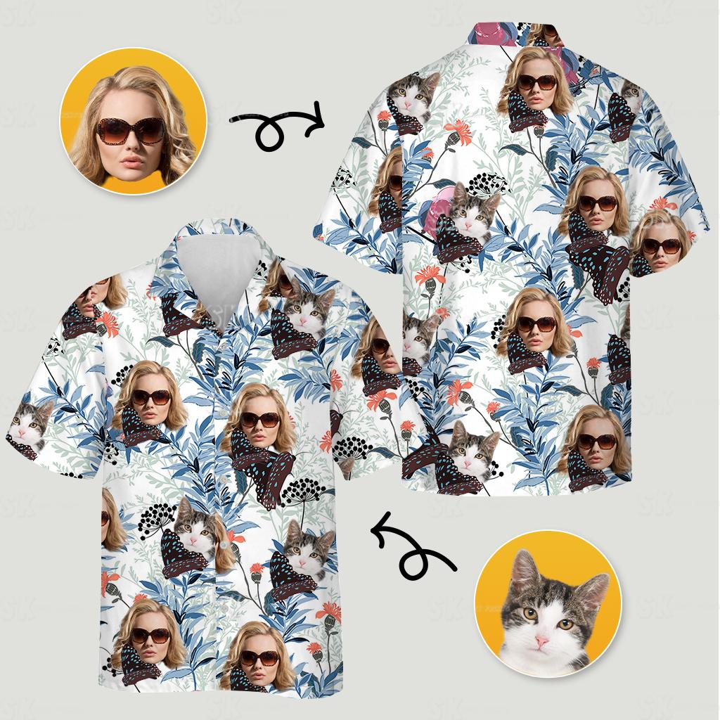 This tropical shirt for women features a show-stopping blend of personalized art and vibrant prints. For instance, our designers combine playful portraits of your choice—think sunglasses selfies or beloved pets—with colorful cats, delicate butterflies, and lush, tropical botanicals. Moreover, these eclectic elements are woven together in a lively pattern that shouts personality and fun. Whether you love every floral detail or simply want something that stands out, this shirt truly feels like a wearable work of art.