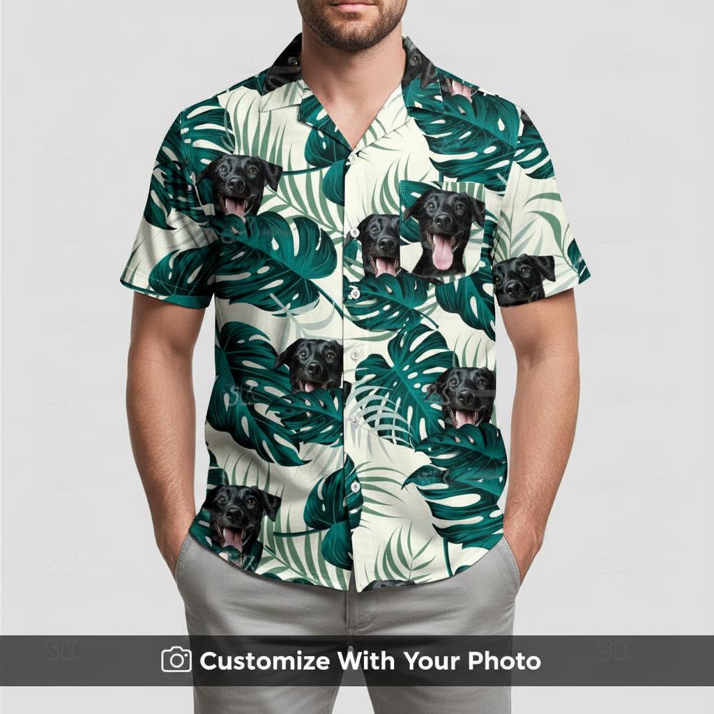 You show up to the family barbecue wearing your golden retriever’s face scattered across white and green tropical leaves. Your cousin immediately pulls out her phone asking where you got it because she needs one with her beagle.
