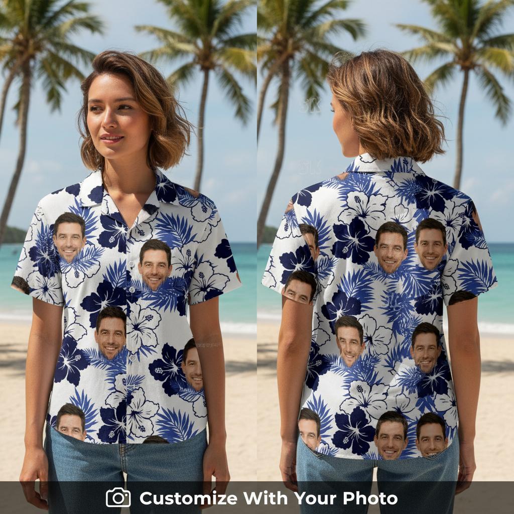 Custom Face Hawaiian Shirt - Blue Floral Design on White Background