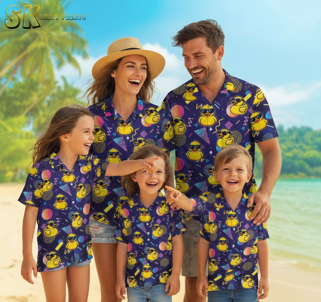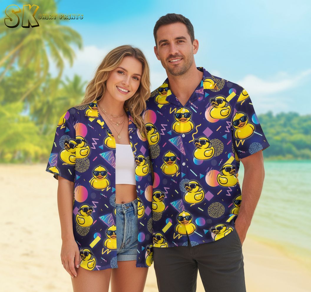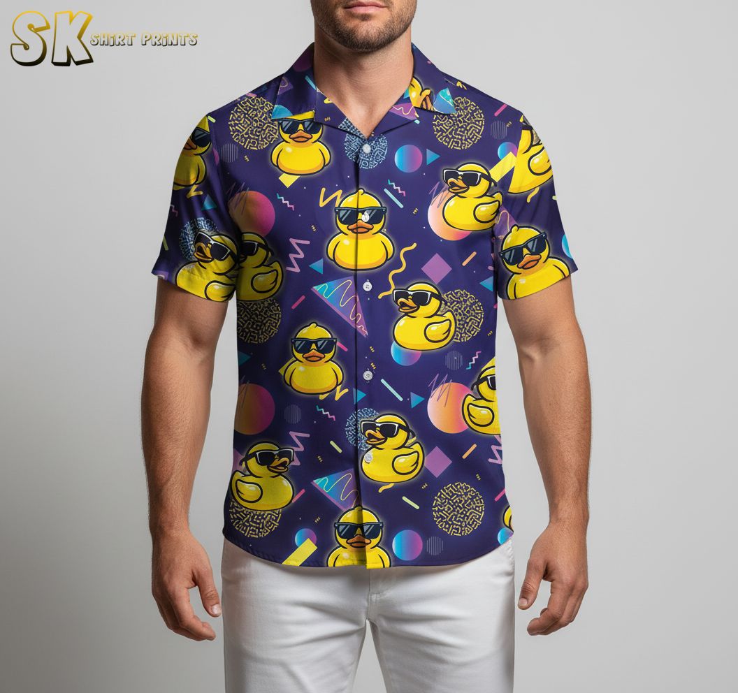Retro Yellow Rubber Duck Hawaiian Shirt for Men with Sunglasses – Neon 80s Button Down Beach Vacation Aloha Shirt