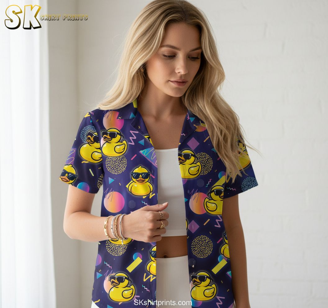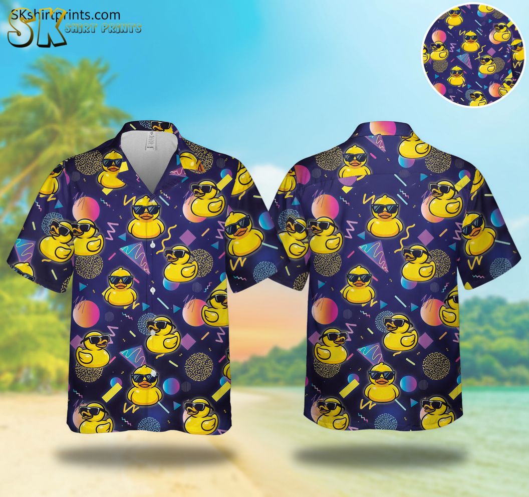 Retro Yellow Rubber Duck Hawaiian Shirt for Men with Sunglasses - Neon 80s Button Down Beach Vacation Aloha Shirt
